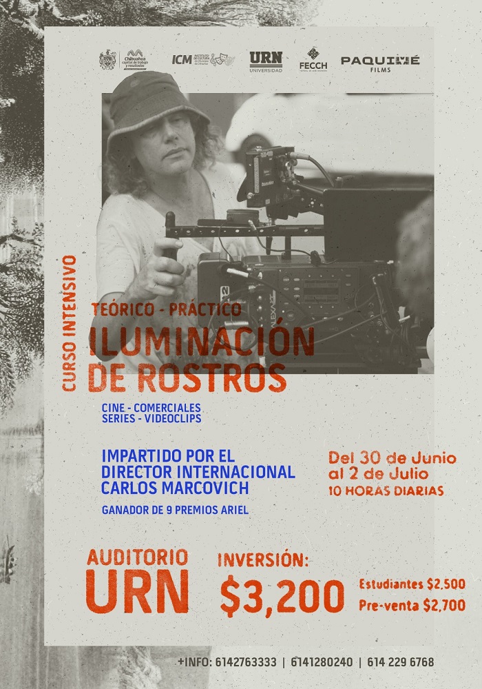 Chihuahua, Chih.- El Gobierno Municipal, a través del Instituto de Cultura del Municipio, invita a las y los interesados a inscribirse al curso intensivo teórico-práctico “Iluminación de Rostros” para cine, comerciales, series y videoclips que será impartido en el auditorio de la Universidad Regional del Norte (URN) del 30 de junio al 2 de julio, a cargo del director internacional de cine Carlos Marcovich.