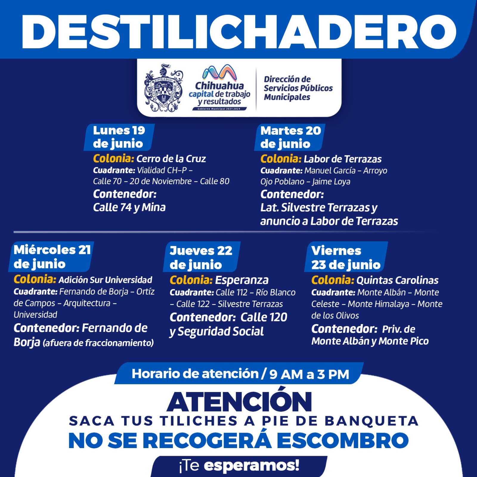 Chihuahua, Chih.- La Dirección de Servicios Públicos Municipales, informa a la ciudadanía el calendario del programa Destilichadero que se realizará del 19 al 23 de junio, en cinco colonias de Chihuahua Capital.