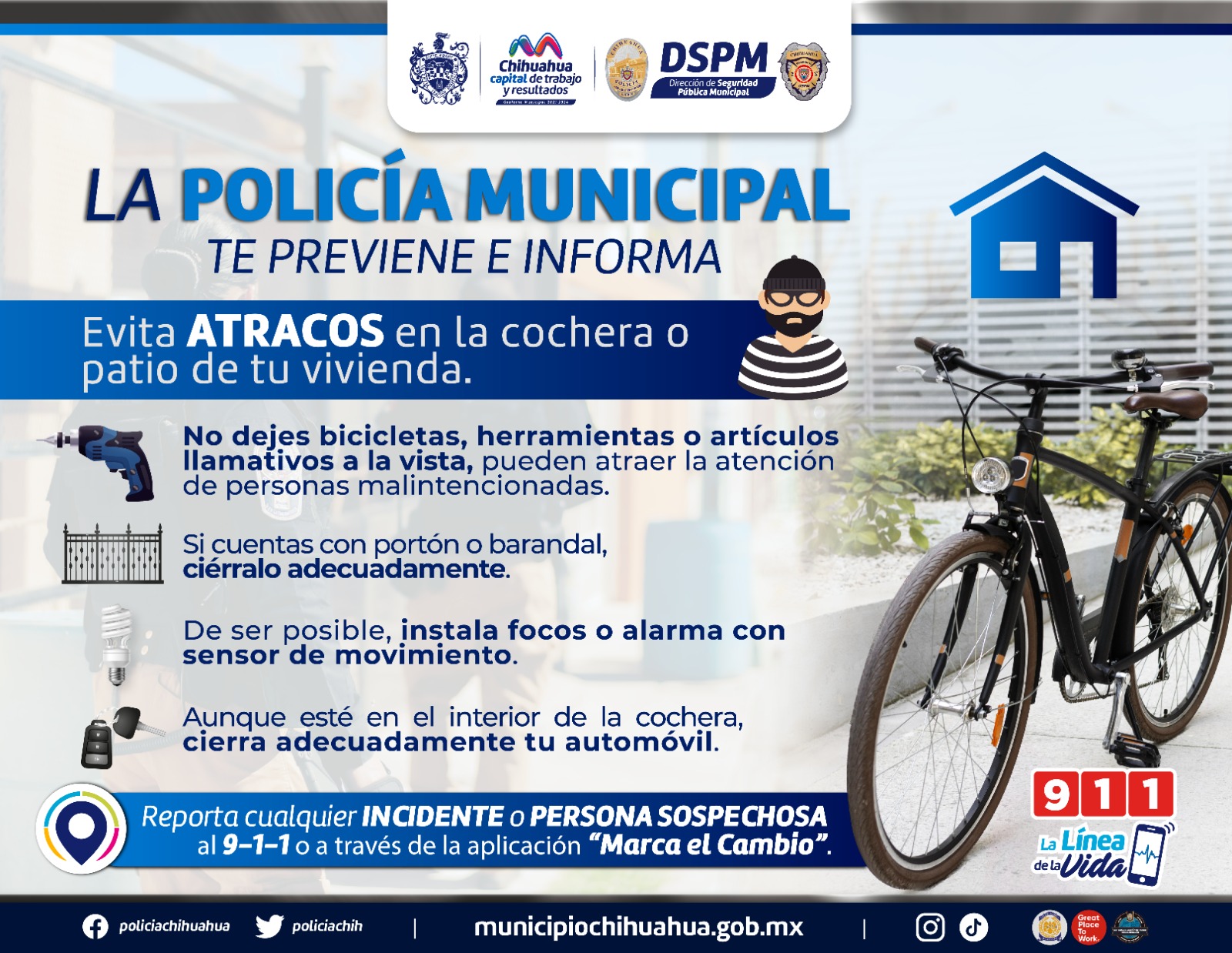Chihuahua, Chih.- Con el fin de prevenir posibles atracos en cocheras y patios de viviendas, el Gobierno Municipal, a través de la Dirección de Seguridad Pública (DSPM), emite las siguientes recomendaciones para evitar convertirse en víctima de personas mal intencionadas que buscan apoderarse de objetos ajenos de manera fácil y rápida.