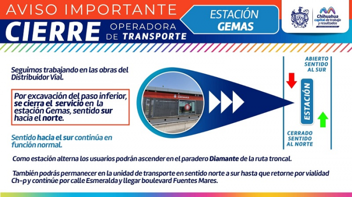 Chihuahua, Chih.- El próximo lunes 26 de junio debido a la continuación de las labores de construcción del paso inferior del Distribuidor Vial Sur, la estación Gemas del sistema de trasporte público, se verá afectada para el ascenso y descenso en sentido sur a norte de la ruta troncal, por lo que el Gobierno Municipal a través de la Dirección de Obras Públicas y la Operadora de Transporte OTV del Gobierno del Estado invita a la ciudadanía a seguir las siguientes alternativas de viaje: