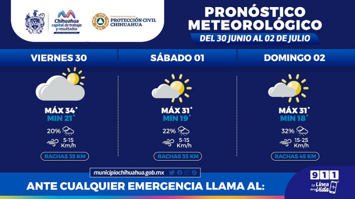 Chihuahua, Chih.- La Coordinación Municipal de Protección Civil, informa que del 30 de junio al 2 de julio, se prevén temperaturas máximas de 34°C y las mínimas de 18°C, con una probabilidad de lluvia de hasta 32 por ciento.