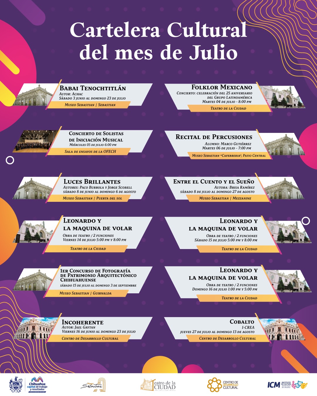 Chihuahua, Chih.- El Gobierno Municipal de Chihuahua que preside el alcalde Marco Bonilla, a través del Instituto de Cultura Municipal, da a conocer el calendario de actividades del mes de julio, con el propósito de invitar a la ciudadanía a aprovechar el periodo vacacional de las escuelas, para acercarse a la cultura y las artes.