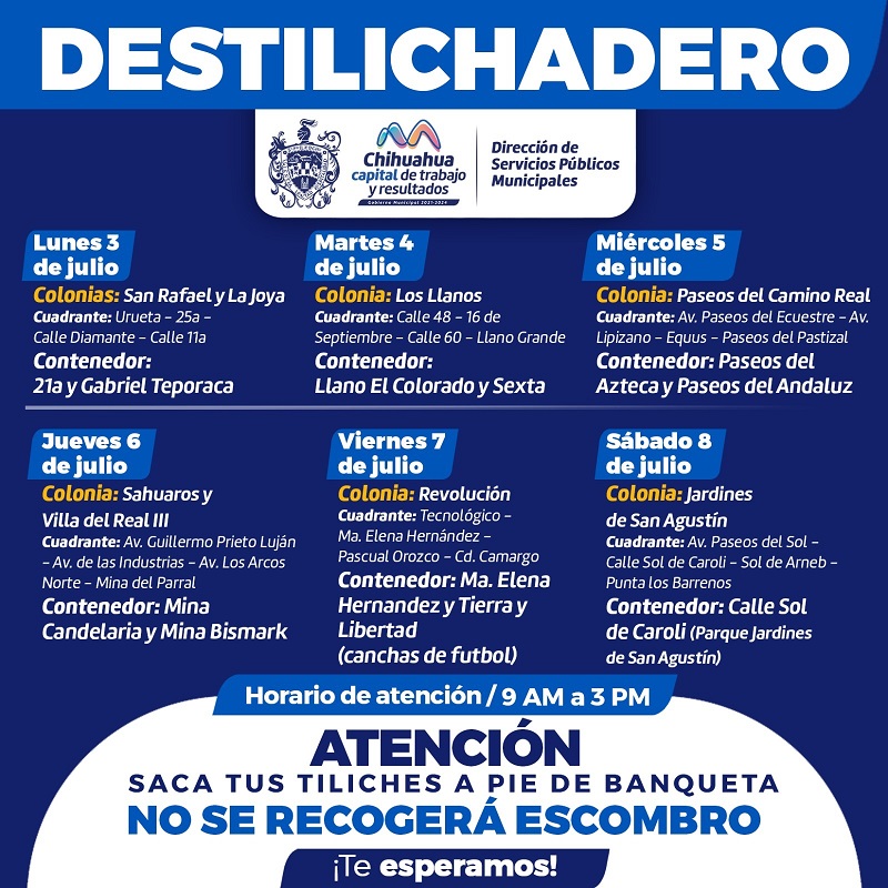 Chihuahua, Chih.- El Gobierno Municipal de Chihuahua, encabezado por Marco Bonilla, a través de la Dirección de Servicios Públicos Municipales, informa a la ciudadanía el calendario del programa Destilichadero que se realizará del 3 al 8 de mayo de abril, en ocho colonias de Chihuahua Capital.