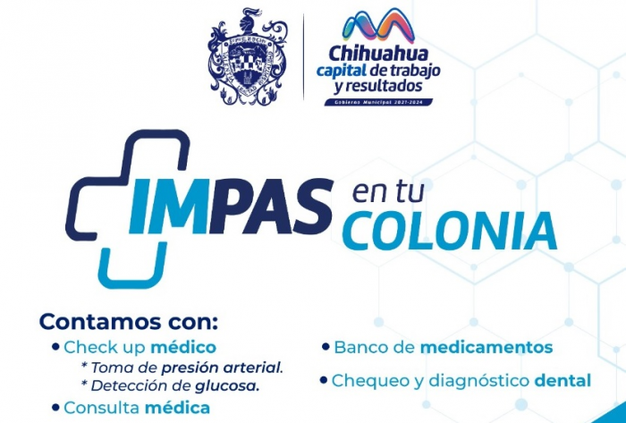 Chihuahua, Chih.- Abonando a la visión del alcalde Marco Bonilla, de hacer de Chihuahua una Capital de trabajo y resultados, el Gobierno Municipal de Chihuahua, a través del Instituto Municipal de Prevención y Atención a la Salud (IMPAS), invita a las familias de la Capital a aprovechar los servicios gratuitos en los consultorios móviles del programa “IMPAS en Tu Colonia”.