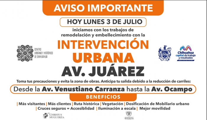 Primero, se iniciará con trabajos de desmonte de postes, cabinas telefónicas, así como mobiliario urbano existente, para después comenzar con la demolición de las banquetas de las aceras siguientes sobre la avenida Juárez: