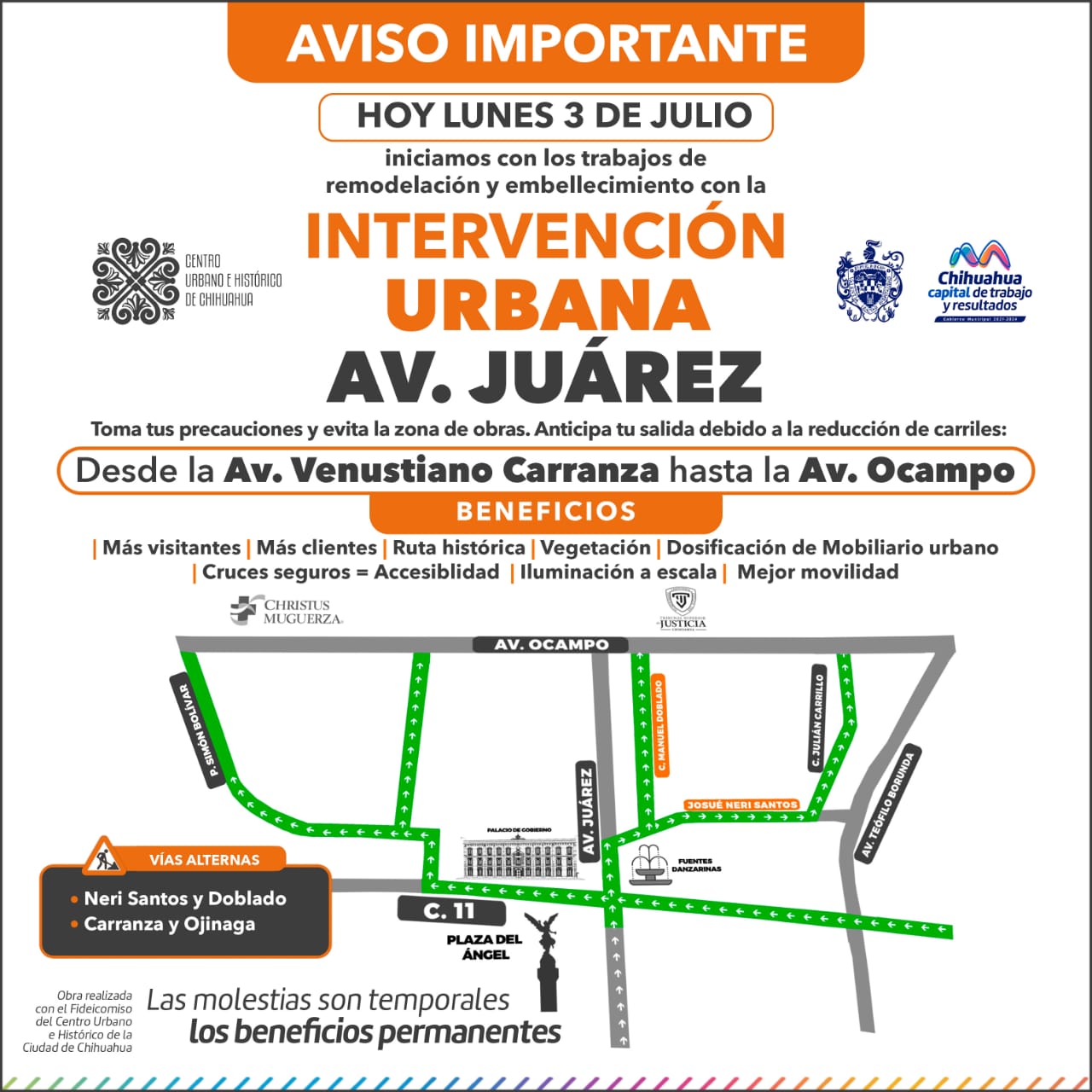 Asimismo, se invita a la ciudadanía que transita por esta zona, a tomar las precauciones necesarias ya que habrá reducción de carriles en la avenida Juárez, así como planificar con antelación las rutas alternas.