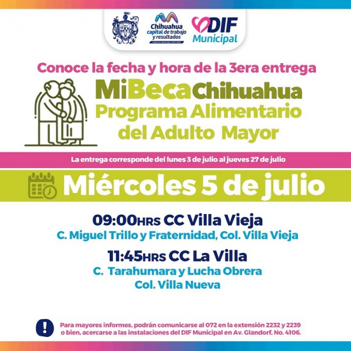 Chihuahua, Chih.- En atención al compromiso que el alcalde, Marco Bonilla, tiene con las y los adultos mayores de Chihuahua Capital, para garantizarles una mejor calidad de vida, el Gobierno Municipal, a través del DIF, informa a la ciudadanía que el miércoles, 5 de julio, las y los beneficiarios del Programa Alimentario del Adulto Mayor (PAAM) podrán acudir por su apoyo alimentario a los centros comunitarios Villa Vieja, a las 9:00 horas, y a La Villa, a las 11:45 horas.