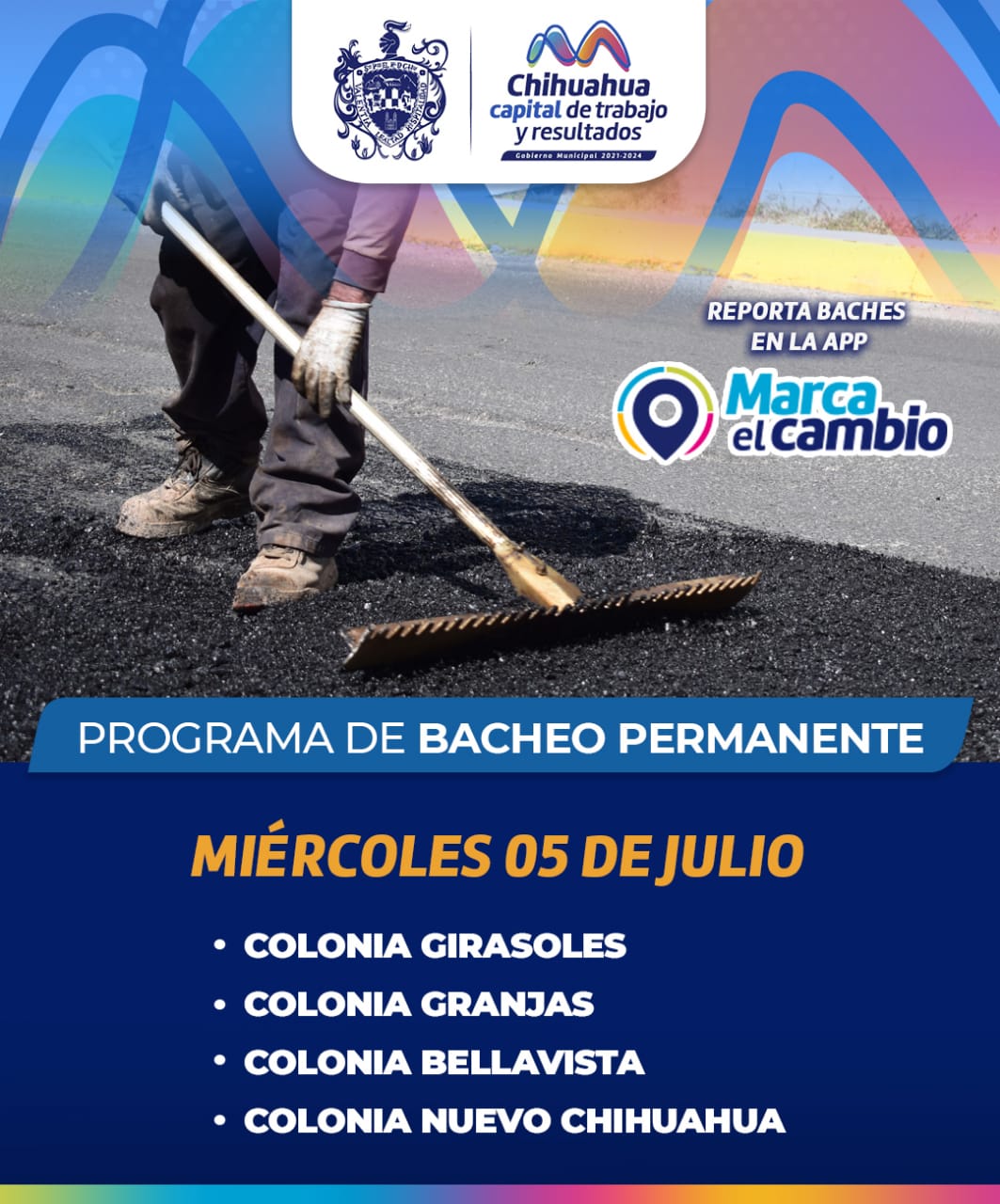 Chihuahua, Chih.-Hoy, miércoles 5 de julio, trabajarán cuatro cuadrillas en las colonias Girasoles, Granjas, Bellavista y Nuevo Chihuahua, para mantener las calles y avenidas en condiciones óptimas para una circulación vehicular y peatonal segura.