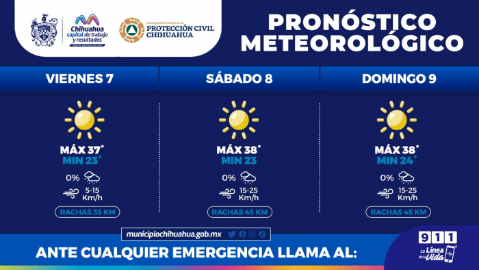 Chihuahua, Chih.- La Coordinación Municipal de Protección Civil, informa que este fin de semana, del 7 de julio al 14 de julio, se prevén temperaturas máximas de 38°C y la más mínima de 23°C, con cielo mayormente soleado, por lo que exhorta a la población a prevenir golpes de calor.