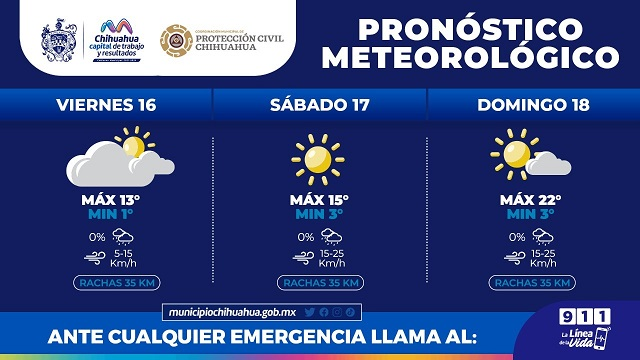 Chihuahua.- La Coordinación Municipal de Protección Civil, informa que, para el fin de semana