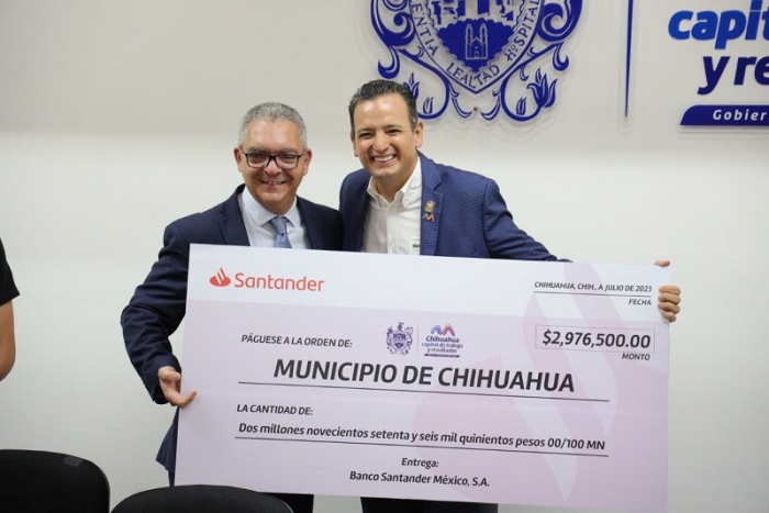 Chihuahua, Chih.- El alcalde de Chihuahua, Marco Bonilla Mendoza, encabezó la entrega de un donativo por parte de funcionarios del Banco Santander por la cantidad de 2 millones 976 mil 500 pesos, que será destinado al fondo de Becas de Competitividad.