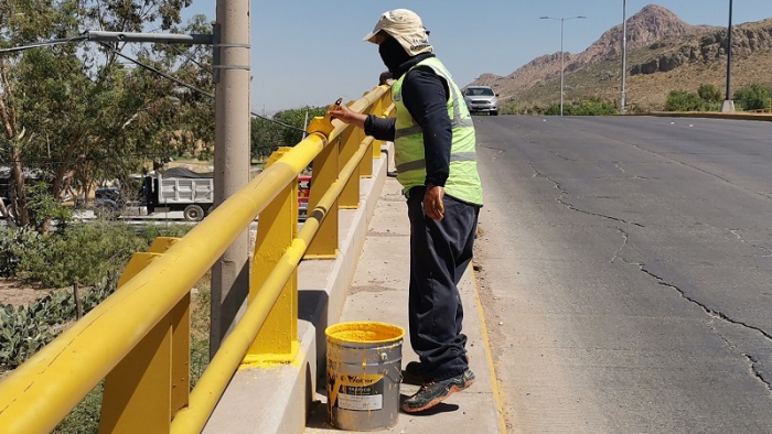 Chihuahua, Chih.- El Gobierno Municipal liderado por el alcalde Marco Bonilla, a través de la Dirección de Mantenimiento Urbano (DMU), pintó más de 6 mil 300 metros lineales de barandales de contención de los puentes ubicados en el Distribuidor Vial Universitario, ubicado en la avenida Homero y la vialidad Sacramento.