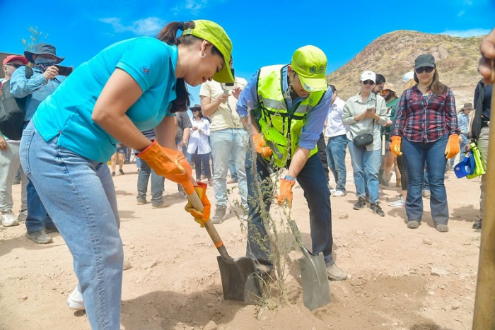 Chihuahua, Chih.- El alcalde de Chihuahua Marco Bonilla, junto con vecinos de la zona Romanzza y asociaciones civiles, iniciaron con la plantación de mil 800 árboles en las áreas de amortiguamiento del Relleno Sanitario, para dar inicio a la remediación de la zona y creación de una barrera natural para reducir los malos olores que emiten la descomposición de los desechos.