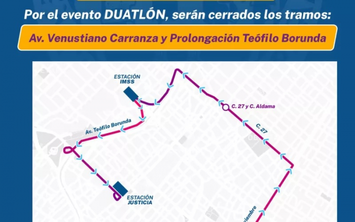 Las unidades de transporte de la Operadora circularán con normalidad en sentido sur a norte hasta estación Sagrado Corazón (ubicada en avenida Ocampo), desde donde se desviarán por la avenida 20 de noviembre hacía la calle 27ª para tomar la avenida Teófilo Borunda hasta avenida Universidad en donde se reincorporarán a la ruta en Estación IMSS. En este sentido se permitirá el ascenso y descenso de los usuarios por la puerta del chofer en los siguientes puntos: