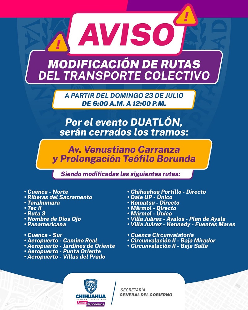 Chihuahua, Chih.- El Gobierno del Estado anuncia modificaciones en el servicio de transporte de la Ruta Troncal 1 y rutas alimentadoras para este 23 de julio debido a la realización del evento “Duatlón” Ciudades Capitales organizado por el ayuntamiento de Chihuahua