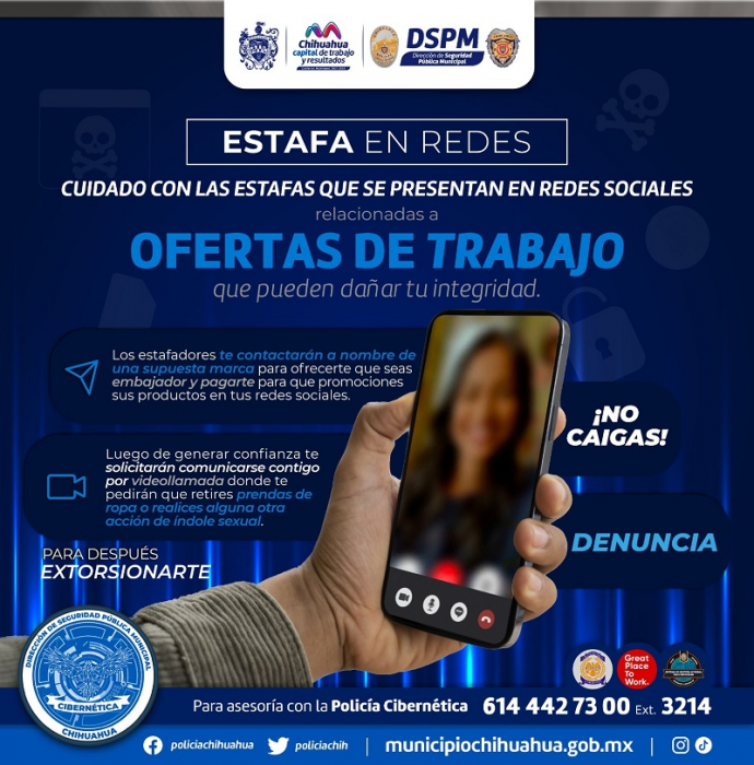 Chihuahua, Chih.- Debido a varios casos que se han recibido la Policía Cibernética del Municipio, referentes a mujeres que fueron extorsionadas por supuestos empresarios que les pidieron despojarse de sus prendas después de generar confianza en ellas, el gobierno capitalino exhorta a no caer en este tipo de estafas, pues se trata de evidentes engaños.