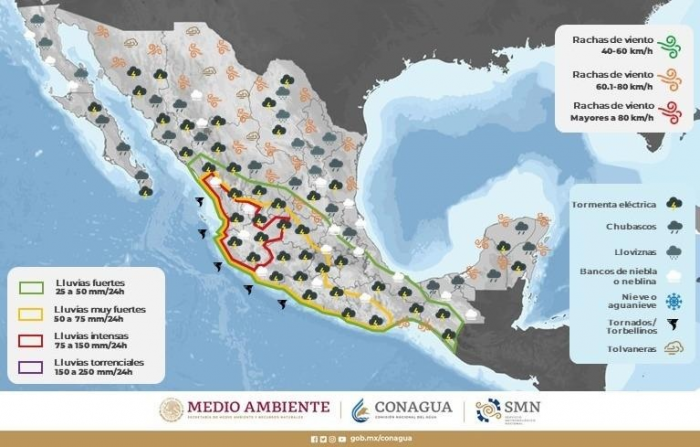 También se esperan lluvias de dispersas a moderadas con sobre los municipios de Guadalupe y Calvo, Temósachic, Moris, Ocampo, Uruachi, Chínipas, Guazapares, Urique, Batopilas y Morelos.