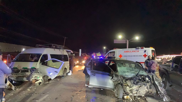 Chihuahua, Chih. - Durante la noche de este domingo se registró un fuerte choque casi al finalizar la avenida Tecnológico en el sentido sur a norte, esto cuando el conductor de un vehículo Chevrolet rojo intentó revisar por un carril, pero terminó por brincar el camellón y así impactar 3 autos más.Debido al fuerte choque al menos 4 personas resultaron lesionadas, por lo que tuvieron que ser atendidas por paramédicos de Cruz Roja quienes evaluaron quienes debían ser trasladados a un hospital.