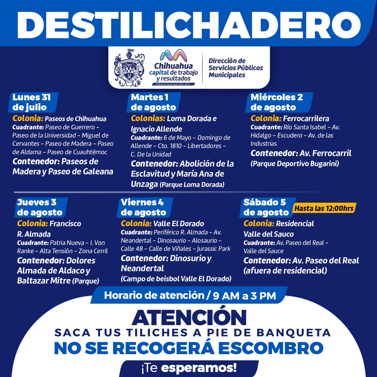 Chihuahua, Chih.- El Gobierno Municipal que encabeza el alcalde Marco Bonilla, a través de la Dirección de Servicios Públicos Municipales, informa a la ciudadanía el calendario del programa Destilichadero que se realizará del 31 de julio al 5 de agosto, en siete colonias de Chihuahua Capital.
