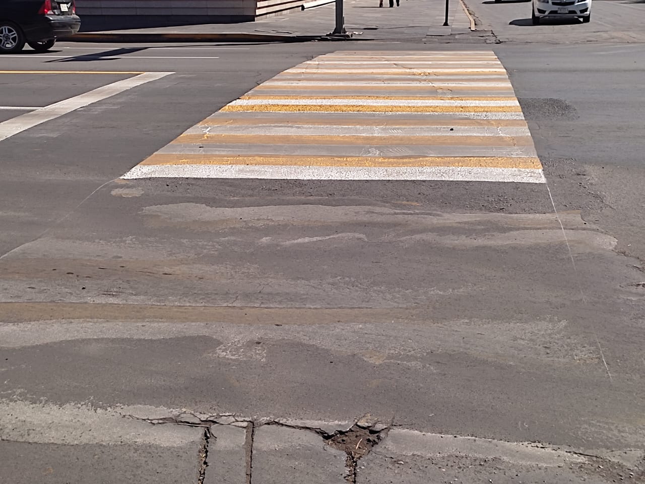 Chihuahua, Chih.- Varios usuarios reportaron el mal estado en el cual se encuentran los pasos peatonales en la zona centro, específicamente en el cruce entre la Avenida Carranza y la Calle Escorza.