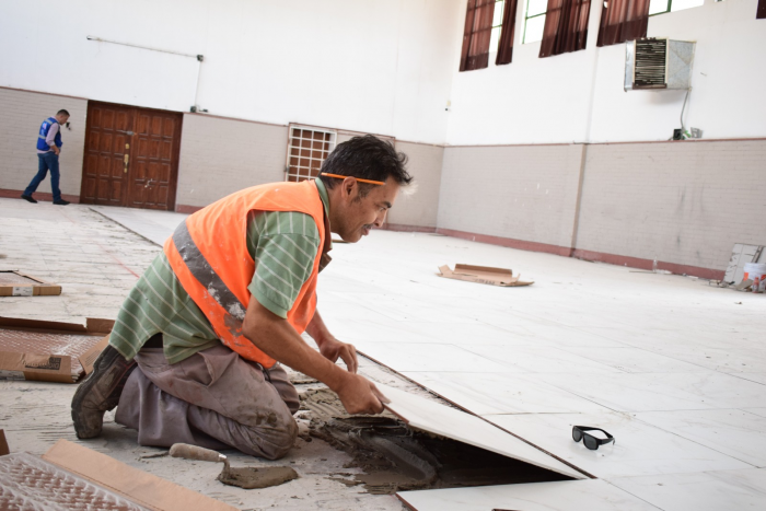 Personal inicio labores con el retiro el retiro de ventanas y piso del lugar que estaba en muy mal estado, para posteriormente colocar 20 ventanas de aluminio y hasta la fecha se han instalado 349 metros cuadrados de piso de cerámica.
