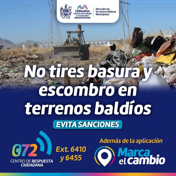 Chihuahua, Chih.- Con el objetivo de mantener una buena imagen urbana, el Gobierno Municipal a través de la Dirección de Servicios Públicos Municipales, invita a la población a evitar tirar basura o escombro en viviendas abandonadas y terrenos baldíos de la ciudad.