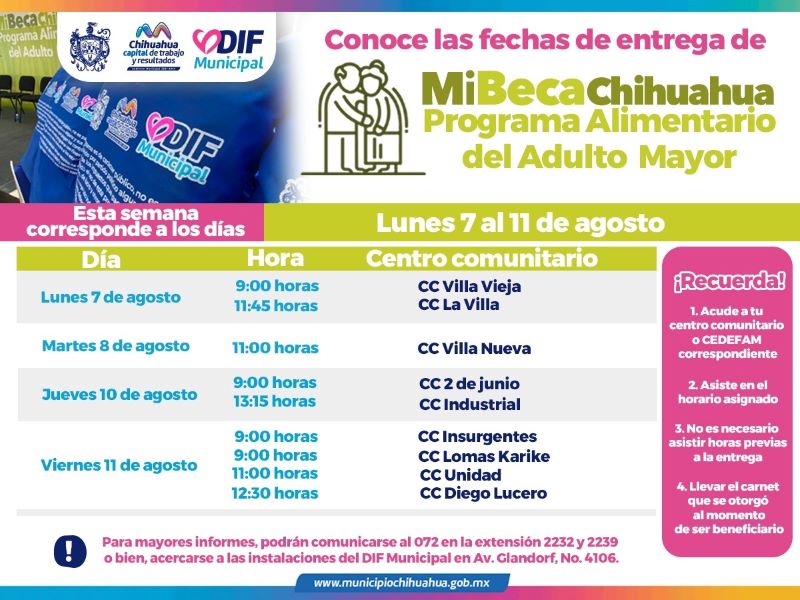 Chihuahua, Chih.- En atención al compromiso que el alcalde, Marco Bonilla, tiene con las y los adultos mayores de Chihuahua Capital, para garantizarles una mejor calidad de vida, el Gobierno Municipal, a través del DIF, informa los días y hora en que podrán acudir a los centros comunitarios a recoger su apoyo del Programa Alimentario del Adulto Mayor (PAAM).