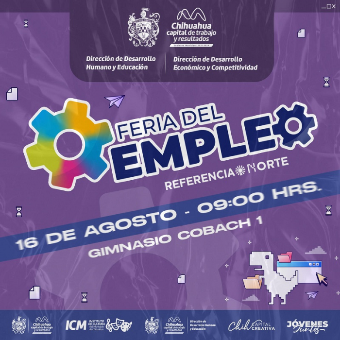 Chihuahua, Chih.- Siguiendo con la encomienda del alcalde Marco Bonilla de generar espacios para el crecimiento de las y los jóvenes, el Gobierno Municipal invita a la próxima Feria de Empleo Joven, este miércoles 16 de agosto de las 09:00 a 17:00 horas en el Gimnasio del Colegio de Bachilleres, plantel 1.