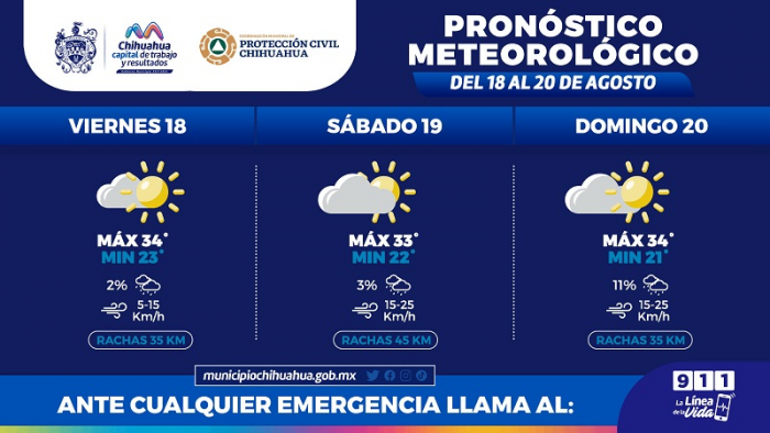 Chihuahua, Chih.- La Coordinación Municipal de Protección Civil, informa a la población que, para este fin de semana, del 18 al 20 de agosto, se prevén temperaturas máximas de 34°C y mínimas de 22°C.