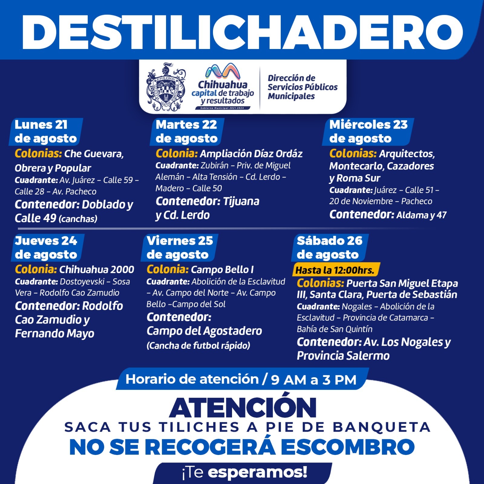 Chihuahua, Chih.- El Gobierno Municipal de Chihuahua, encabezado por Marco Bonilla, a través de la Dirección de Servicios Públicos Municipales, informa a la ciudadanía el calendario del programa Destilichadero que se realizará del 21 al 26 de agosto, en 13 colonias de Chihuahua Capital.