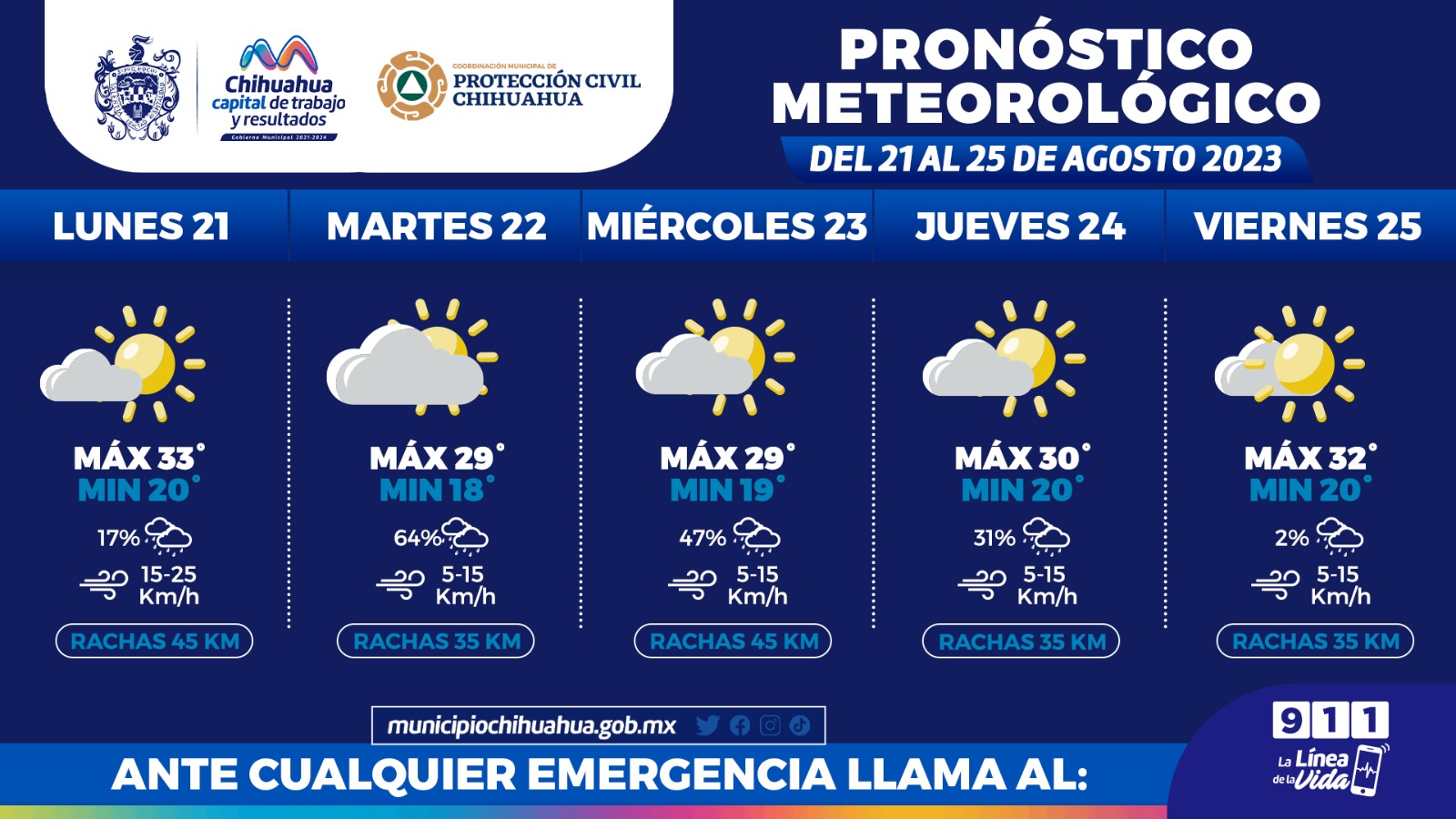 Chihuahua, Chih.- La Coordinación de Protección Civil Municipal informa que para esta semana se pronostican temperaturas máximas de 32°C con mínimas de 18°C, así como lluvias para toda la semana, esto tras el paso del Huracán Hilary, el cual tendrá un ligero impacto de remanentes en nuestro territorio.