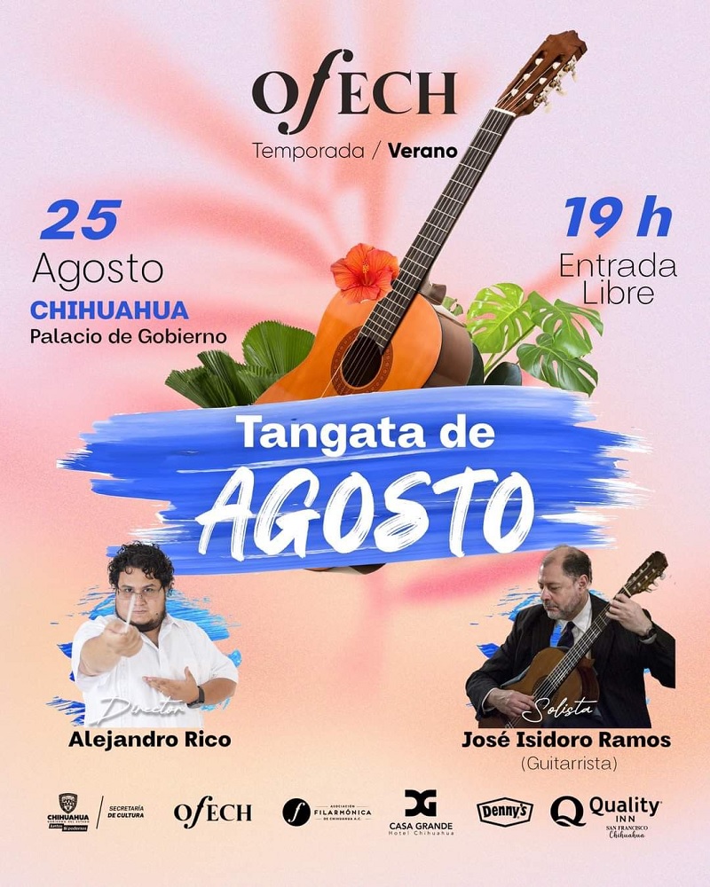 Chihuahua, Chih.- La Secretaría de Cultura invita al último concierto de la Temporada de Verano 2023 de la Orquesta Filarmónica del Estado de Chihuahua (OFECh), "Tangata de Agosto", que estará a cargo del guitarrista José Isidoro Ramos y el director Alejandro Rico, a presentarse el viernes 25 de agosto en Palacio de Gobierno a las 19:00 horas con entrada libre.