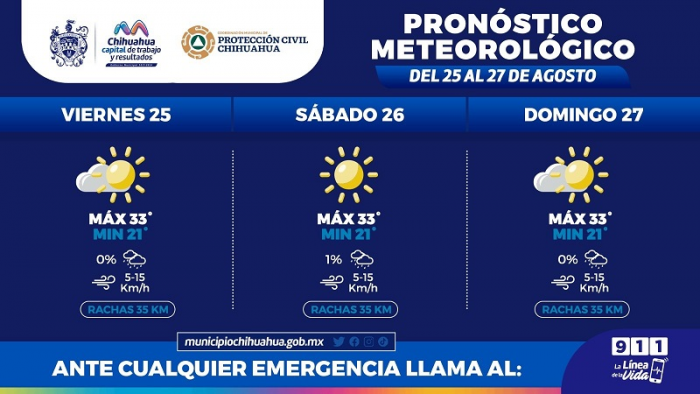 Chihuahua, Chih.- La Coordinación Municipal de Protección Civil, informa que este fin de semana, del 25 al 27 de agosto, se prevén temperaturas máximas de 33°C y la más mínima de 21°C, sin probabilidad de lluvia.