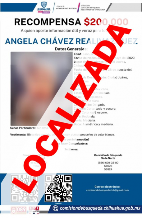 Chihuahua, Chih.- La Fiscal Wendy Chávez, titular de la Fiscalía Especializada en Atención a Mujeres Víctimas del Delito por Razones de Género y a la Familia Zona Norte, dio a conocer esta tarde, que gracias a las acciones de búsqueda y a la colaboración de la ciudadanía, fue localizada la menor que había sido sustraída de un domicilio el pasado lunes en Ciudad Juárez.Informó que, a través del radio operador en turno, a las 17:25 horas, se reportó la localización de la menor Á. C. R., de un año de edad, en el cruce de las calles Primitivo Uro y División, de la colonia Santa María.