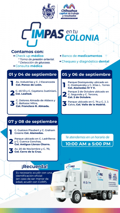 Chihuahua, Chih.- Abonando a la visión del alcalde Marco Bonilla, de hacer de Chihuahua una ciudad de trabajo y resultados, el Gobierno Municipal, a través del Instituto Municipal de Prevención y Atención a la Salud (IMPAS), invita a aprovechar los servicios gratuitos en los consultorios móviles del programa “IMPAS en Tu Colonia” del 1 al 8 de septiembre.