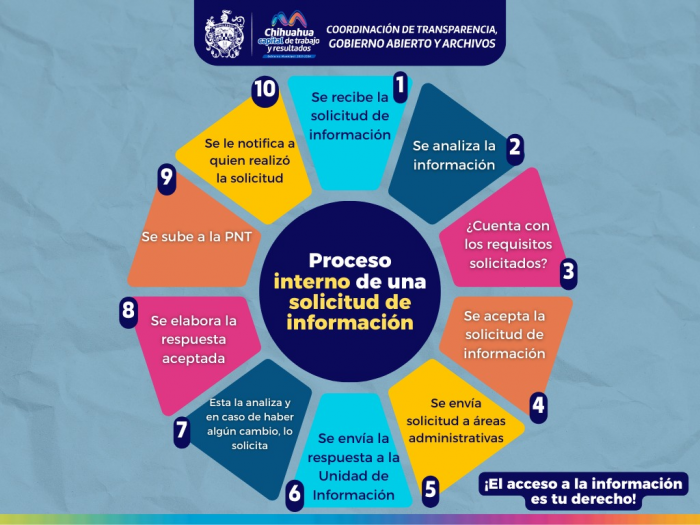 Chihuahua, Chih.- El Gobierno Municipal, a través de la Coordinación de transparencia, Gobierno Abierto y Archivos, comparte el proceso interno que se realiza al recibir una solicitud de información de la ciudadanía.