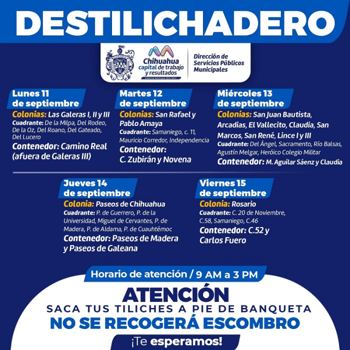 Chihuahua, Chih.- El Gobierno Municipal de Chihuahua, encabezado por Marco Bonilla, a través de la Dirección de Servicios Públicos Municipales, informa a la ciudadanía el calendario del programa Destilichadero que se realizará del 11 al 15 de septiembre, en 15 colonias de Chihuahua Capital.