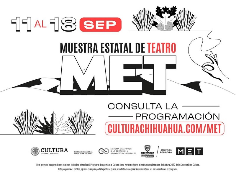 Chihuahua, Chih.- Con el objetivo de impulsar el quehacer artístico local, la Secretaría de Cultura de Chihuahua invita a la Muestra Estatal de Teatro (MET) edición 2023, que del 11 al 18 de septiembre ofrecerá puestas en escena, talleres y conferencias, con entrada gratuita en centros comunitarios de Juárez, Chihuahua, Ahumada, Guadalupe y Praxedis G. Guerrero.
