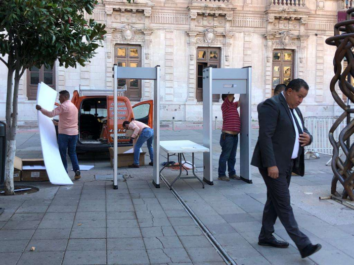 Chihuahua, Chih.- Desde temprana hora llegaron elementos de seguridad privada y gubernamental al Centro Histórico, donde han iniciado con la colocación de arcos para la detención de cualquier tipo de armas.De igual manera están desplegados elementos de diversas corporaciones policiales, militares de inteligencia, muchos de ellos visten de civil para poder infiltrarse y detectar personas que representen un riesgo para los asistentes al grito.
