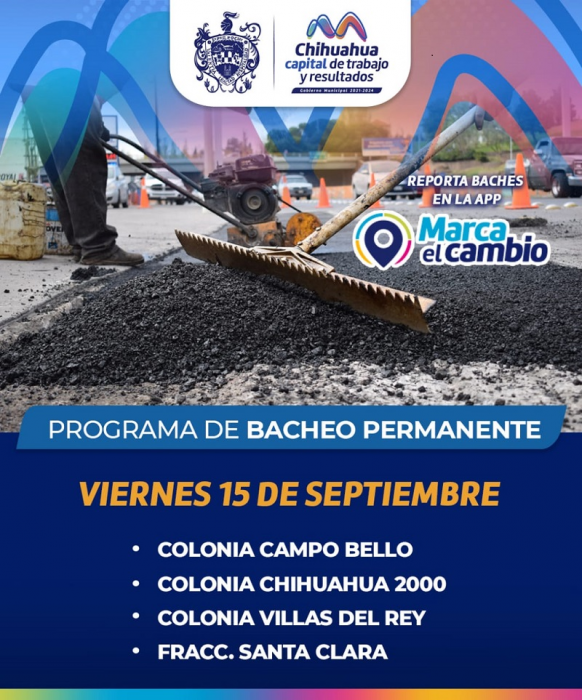 El día de hoy, viernes 15 de septiembre, las cuadrillas trabajarán en las colonias Campo Bello, Chihuahua 2000, Villas del Rey y fraccionamiento Santa Clara.