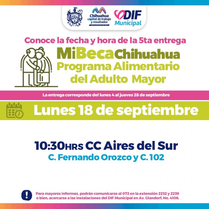 Chihuahua, Chih.- En atención al compromiso que el alcalde, Marco Bonilla, tiene con las y los adultos mayores de Chihuahua Capital, para garantizarles una mejor calidad de vida, el Gobierno Municipal, a través del DIF Municipal, informa a la ciudadanía que este lunes, 18 de septiembre, las y los beneficiarios del Programa Alimentario del Adulto Mayor (PAAM) podrán acudir por su apoyo alimentario al Centro Comunitario Aires del Sur, a partir de las 10:30 am.