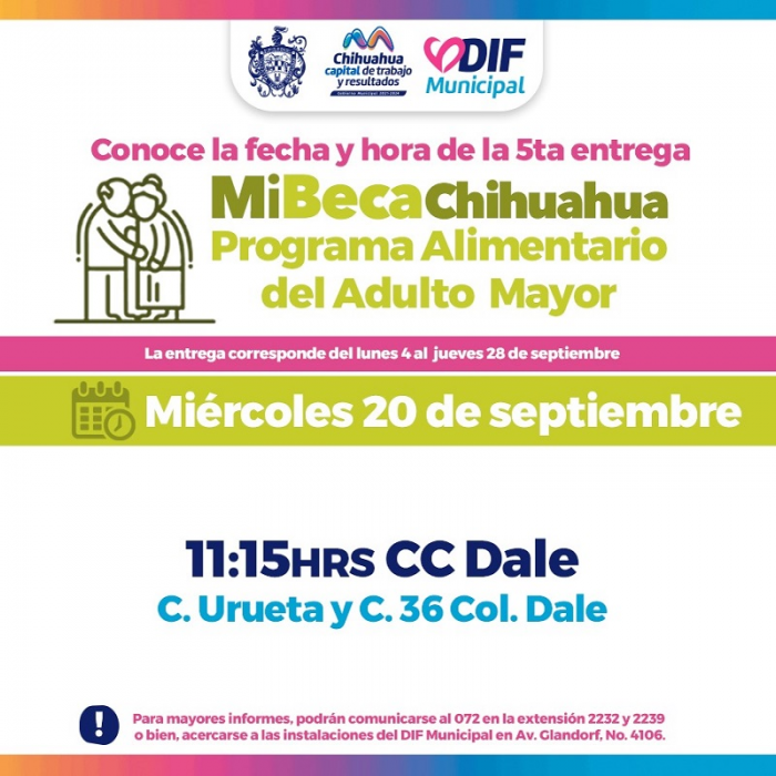 Chihuahua, Chih.- En atención al compromiso que el alcalde, Marco Bonilla, tiene con las y los adultos mayores de Chihuahua Capital, para garantizarles una mejor calidad de vida, el Gobierno Municipal, a través del DIF, informa a la ciudadanía que este miércoles, 20 de septiembre, las y los beneficiarios del Programa Alimentario del Adulto Mayor (PAAM) podrán acudir por su apoyo alimentario al centro comunitario Dale, a partir de las 11:15 horas.