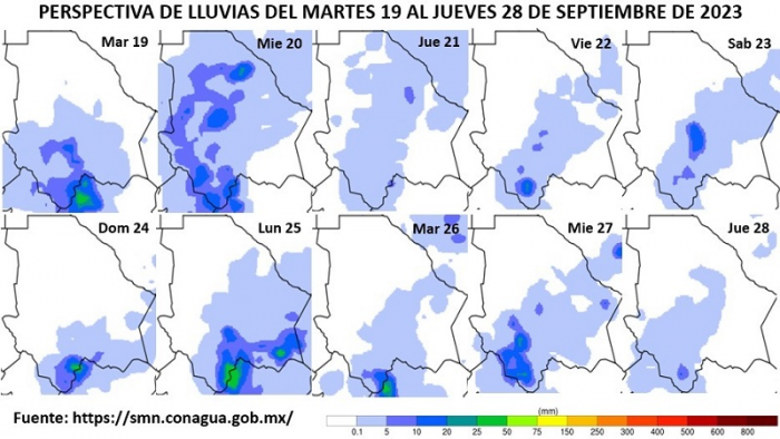 Además de lluvias dispersas a moderadas con chubascos (de 5.1 a 25 mm) en las zonas norte, noroeste, oeste, suroeste y centro, que abarcan municipios como Ascensión, Janos, Nuevo Casas Grandes, Madera, Namiquipa, Guerrero, Bocoyna, Guazapares, Urique, Carichí, Batopilas, Morelos, Guadalupe y Calvo, Guachochi, Balleza, Nonoava, Cuauhtémoc, Riva Palacio, San Francisco de Borja y Chihuahua.