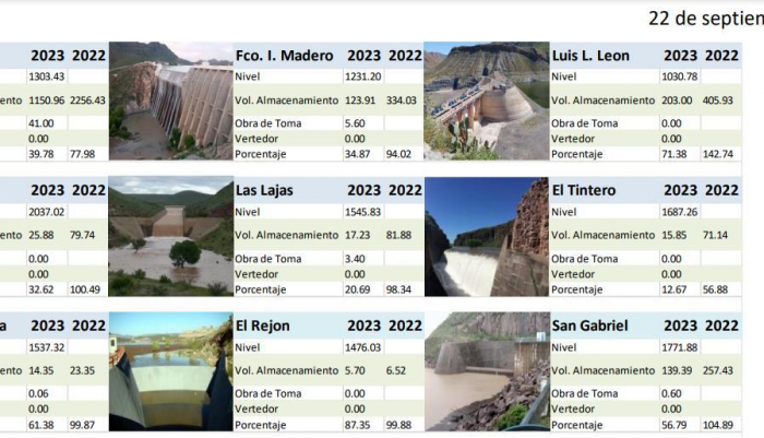 La Comisión Nacional del Agua (Conagua) a través de la subdirección de asistencia técnica operativa, hidrometría y climatología dió a conocer este viernes 22 de septiembre la «Situación actual en las diez principales presas del estado de Chihuahua al día de hoy y comparación con el mismo día del año anterior».