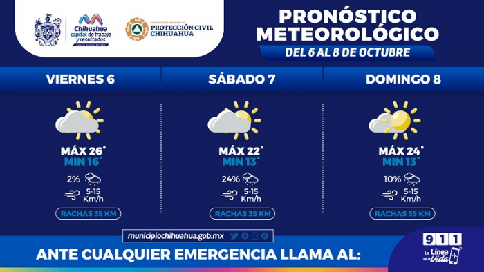 Chihuahua, Chih.- El Gobierno Municipal, por medio de Protección Civil, informa que para este fin de semana del 6 al 8 de octubre, se prevé un descenso en las temperaturas, con una mínima de 13°C, así como probabilidad de lluvias moderadas, por lo que exhortan a seguir las medidas para cuidar la integridad de las familias.