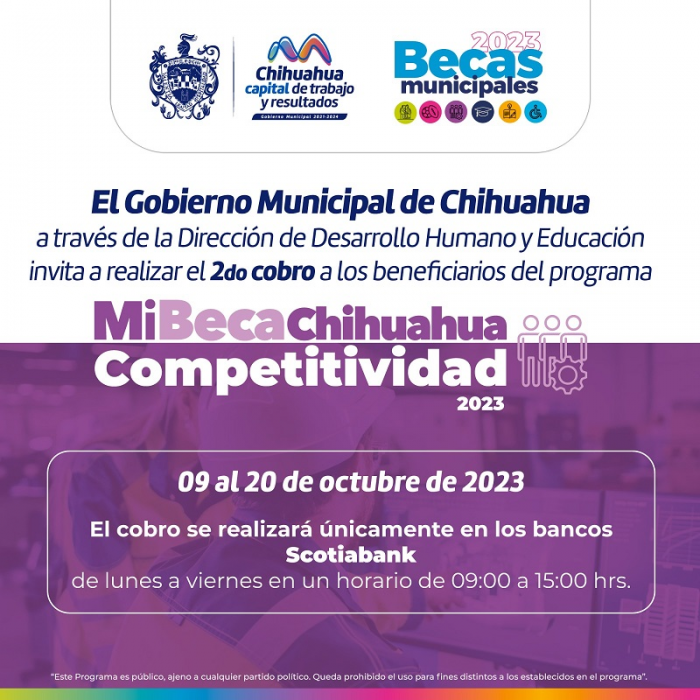 Chihuahua, Chih.- Con la finalidad de fomentar la competitividad desde el área académica y la formación profesional, el Gobierno Municipal, a través de la Dirección de Desarrollo Humano y Educación, invita a estudiantes universitarios beneficiarios del programa “Mi Becas Chihuahua Competitividad 2023” a realizar el segundo cobro.