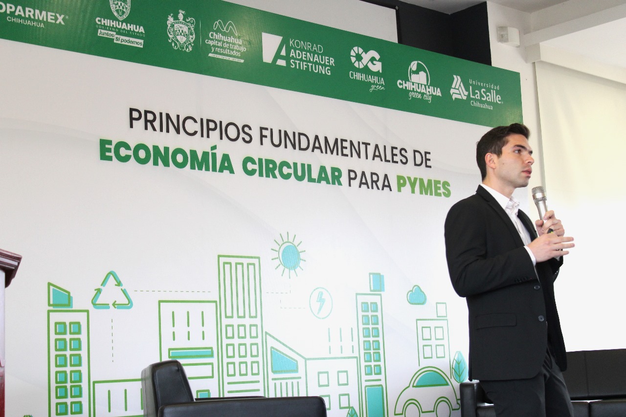 Posteriormente, el Mtro. Jesús Gilberto Elías Ogaz, subdirector de la Industria, de la Dirección de Desarrollo Económico y Competitividad, del Municipio de Chihuahua, habló sobre las “Estrategias de implementación de Economía Circular en las PYMES”, explicando cómo las pequeñas y medianas empresas de la ciudad pueden incorporarse a iniciativas verdes para eficientar sus procesos, y mejorar su modelo de negocio, apoyándose de las estrategias que diseña, y en las que participa el gobierno municipal.