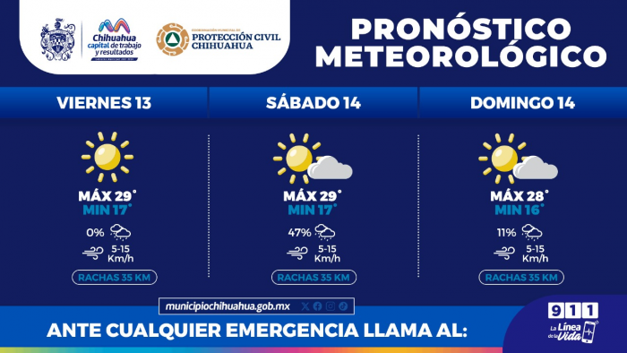 Chihuahua, Chih.- La Coordinación Municipal de Protección Civil, informa que este fin de semana, del 13 al 15 de octubre, se prevén temperaturas máximas de 26°C y la más mínima de 17°C, con lluvias pronosticadas para este sábado y domingo.