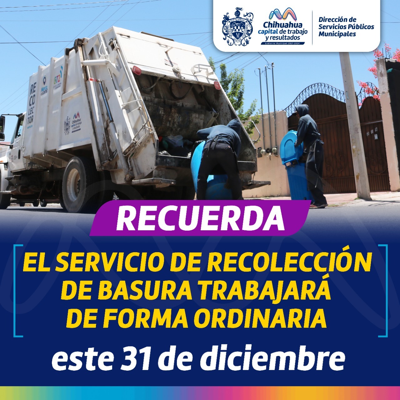 Chihuahua, Chih.- El Gobierno Municipal, a través de la Dirección de Servicios Públicos, informa a la ciudadanía que el servicio de recolección de basura habitacional trabajará de forma ordinaria este 31 de diciembre.