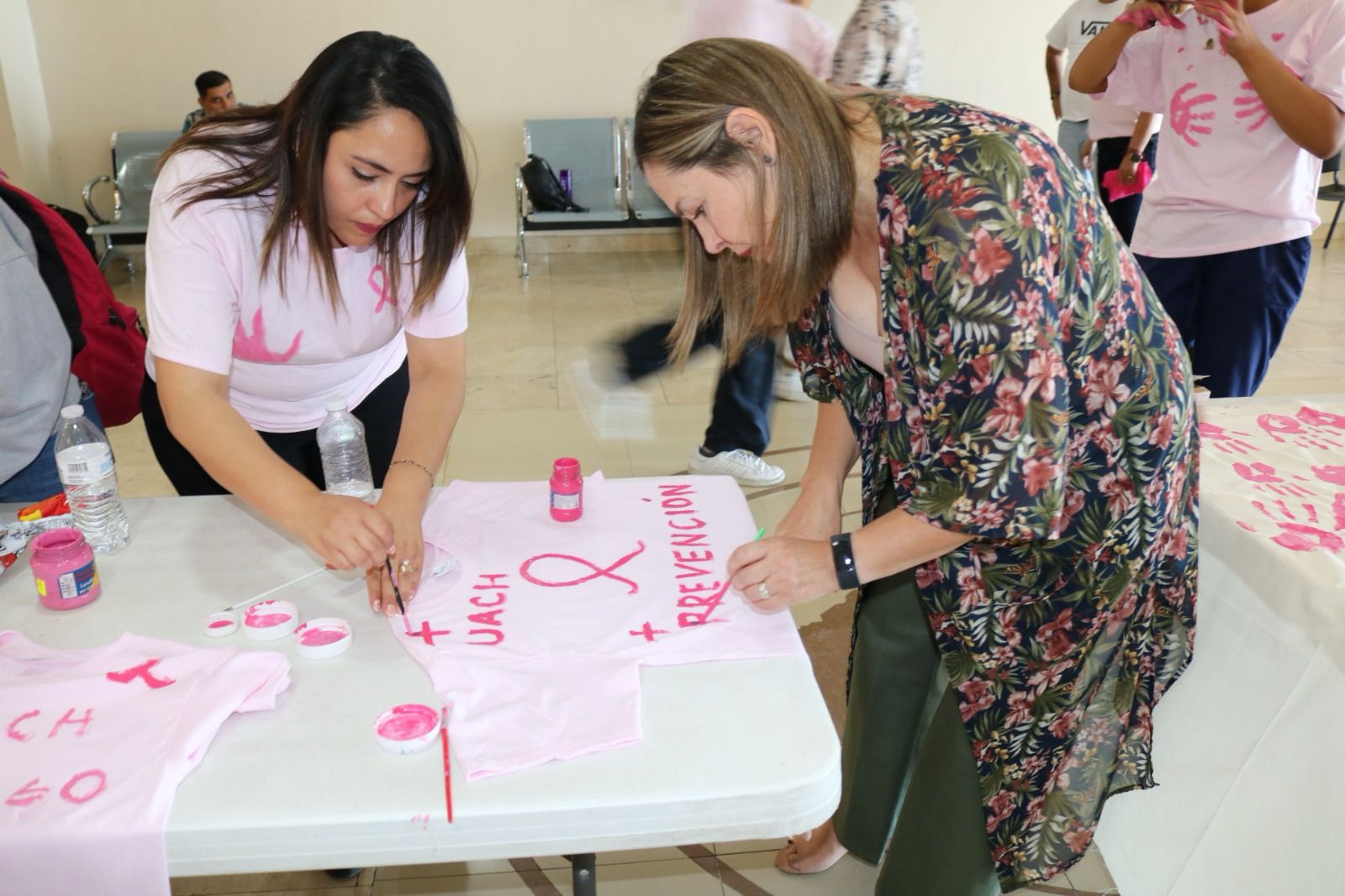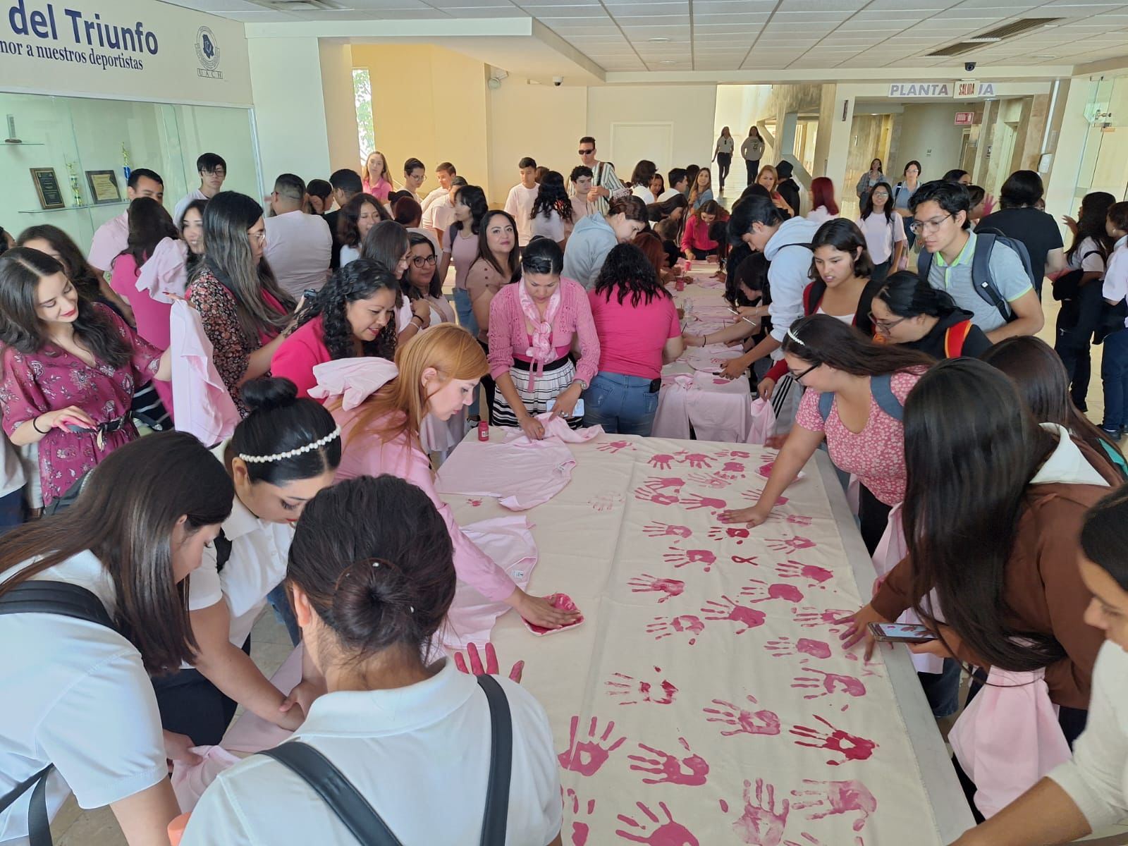 Para esto, los estudiantes organizados compraron 200 playeras rosas, las cuales pintaron con diversos mensajes alusivos a la importancia de la prevención y detección temprana de esta enfermedad.